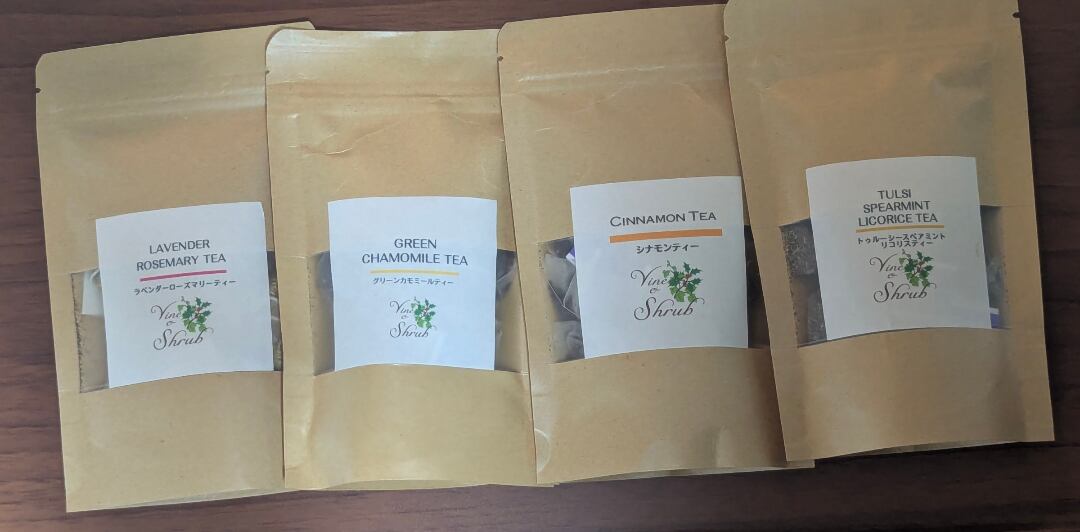 内容量:シナモンティー 10g、グリーンカモミールティー 10g、ラベンダーローズマリーティー 10g、トゥルーシースペアミントリコリスティー 10g